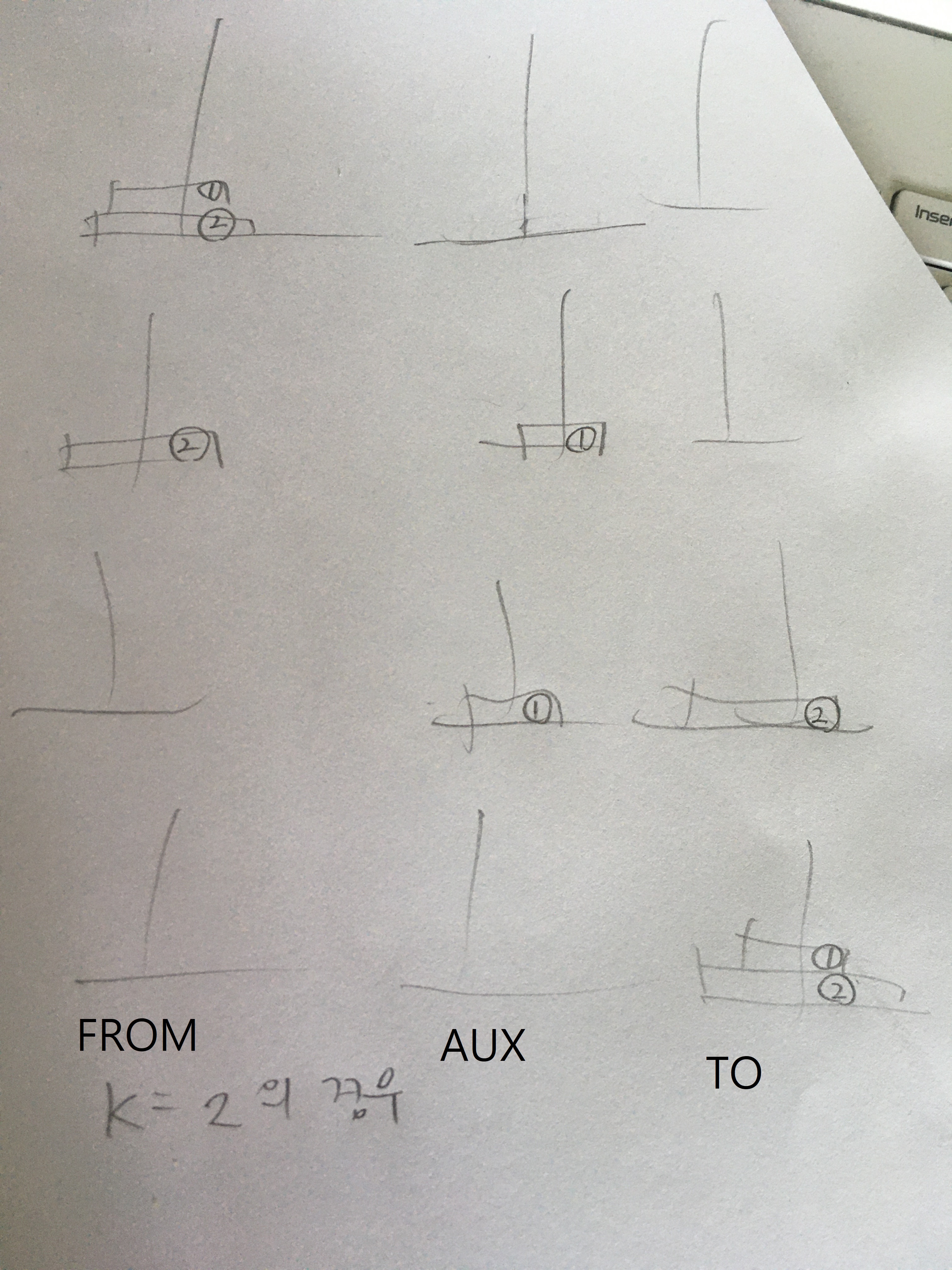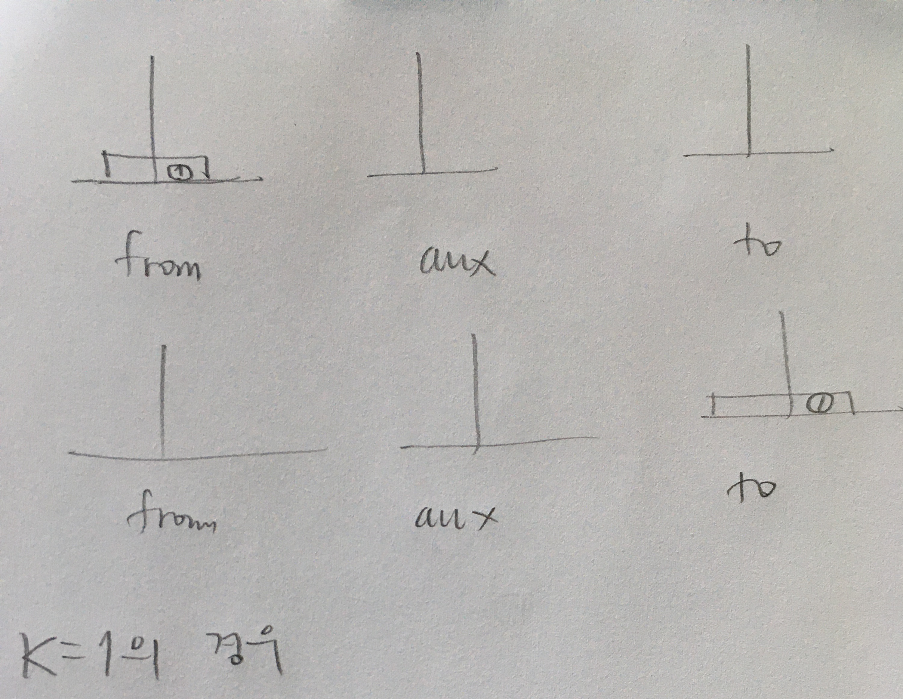 그를 위해서는 움직이는 방법을 재연할 수 있어야 한다. 일단 k = 1인 경우를 보자. 간단히 from -> to로 옮기면 된다