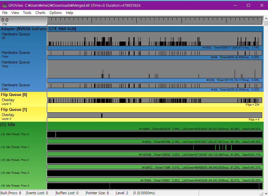 이걸 GPUView로 살펴보자. 위에 언급한대로 로깅하고 GPUView를 실행 한 후 Merged.etl 파일을 열어본다. 파싱 작업이 끝나면 다음과 같은 화면이 표시된다.