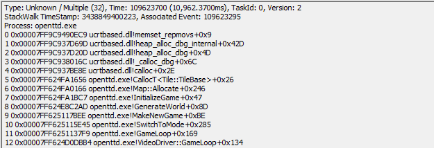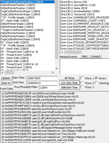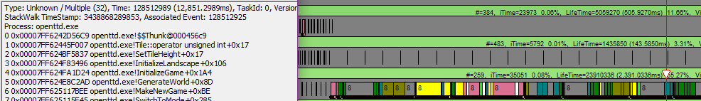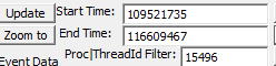 Selection Time을 누르면 선택된 구간의 이벤트들만 필터링한다.우리는 openttd.exe의 메인 스레드인 TID 12804의 이벤트를 먼저 살펴보는 것이 맞을 것이다. Proc|ThreadId Filter에 15496를 입력하고 엔터키를 누른다. 특정 스레드의 이벤트들만 표시된다.
