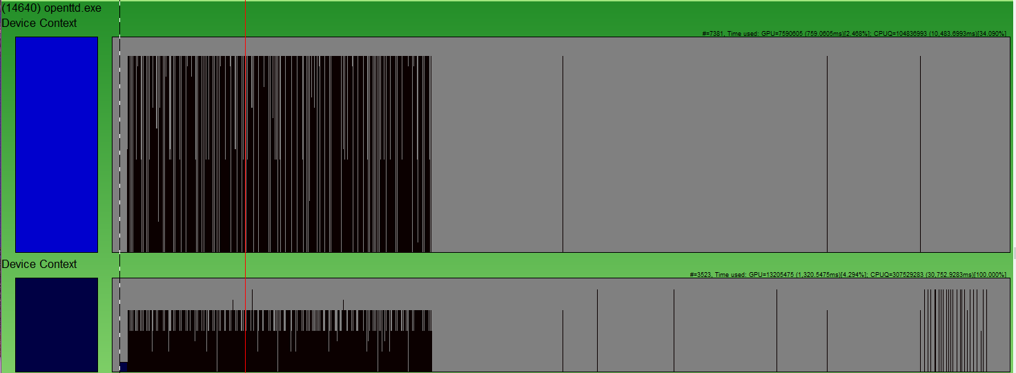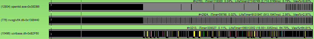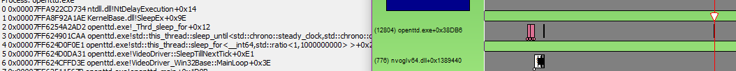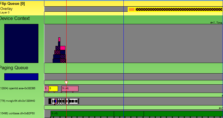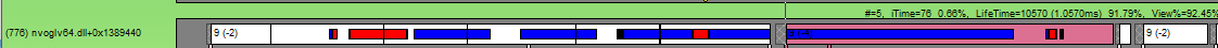 nvoglv64.dll 스레드를 보자. 이것은 Nvidia 그래픽 드라이버이다. 좀더 확대해보자. 청색은 DirectX 드라이버에서 실행되고 있음을 뜻한다. 적색은 커널 모드 드라이버에서 실행되고 있음을 듯한다.