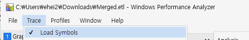 그래도 심볼이 잘 연결되지 않을 경우 미리 내려받는 방법도 있다. Meged.etl을 Windows Performance Analyzer로 열고, Load Symbols을 선택하면 심볼을 로컬 저장소에 내려받는다.