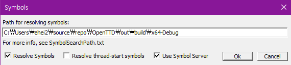 Options > Symbol Path를 선택해서 OpenTTD 심볼 파일의 경로를 입력하고 심볼 서버도 사용한다고 체크하자. 그리고 OK를 누르면 심볼이 연결될 준비가 끝난다.