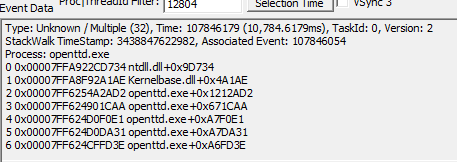 NT - Stack Walk가 호출 체인을 캡처한 것이다. 이 중 하나를 선택하면 아래처럼 표시된다. 심볼이 연결되지 않았기 때문이다.