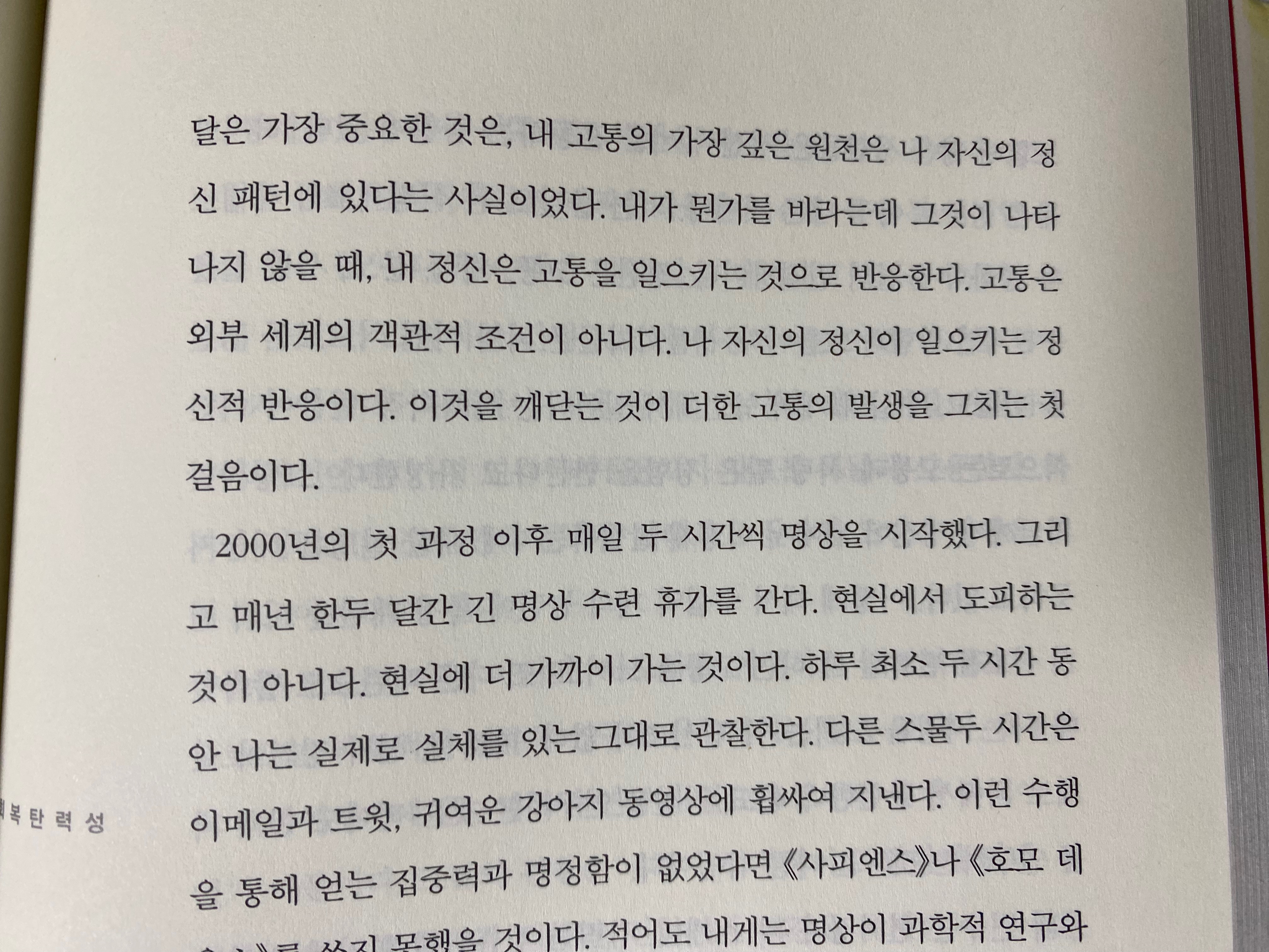 내가 깨달은 가장 중요한 것은, 내 고통의 가장 깊은 원천은 나 자신의 정신 패턴에 있다는 사실이었다. 내가 뭔가를 바라는데 그것이 나타나지 않을 때, 내 정신은 고통을 일으키는 것으로 반응한다. 고통은 외부 세계의 객관적 조건이 아니다. 나 자신의 정신이 일으키는 정신적 반응이다. 이것을 깨닫는 것이 더한 고통의 발생을 그치는 첫 걸음이다.